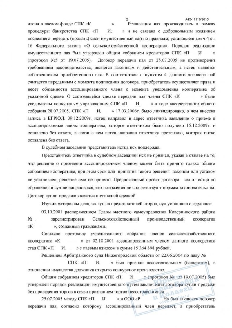 Кооператив «К» не признавал ООО «Р-Н» пайщиком, ссылаясь на уставные ограничения и отсутствие решения общего собрания. Мы подготовили и направили в суд иск о признании ООО «Р-Н» ассоциированным членом кооператива с правом на получение дивидендов от стоимости пая. В ходе судебного разбирательства были представлены доказательства приобретения пая, правопреемства в связи с ликвидацией первоначального пайщика и отсутствие устава кооператива, препятствующего такому переходу.