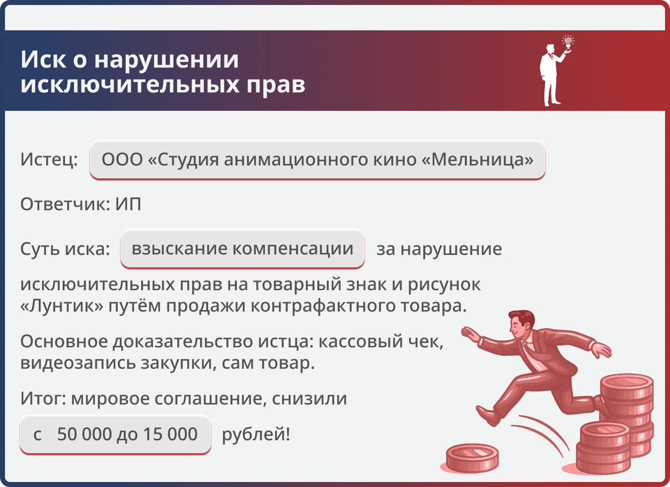 Истец (ООО «Студия анимационного кино «Мельница») обратился в суд с иском к ИП о взыскании 50 000 руб. компенсации за нарушение исключительных прав на товарный знак по свидетельству №310284 и произведение изобразительного искусства — рисунок «Лунтик». Дело было принято к рассмотрению в порядке упрощённого производства. Стороны сообщили суду о намерении урегулировать спор мирно и представили подписанное мировое соглашение.