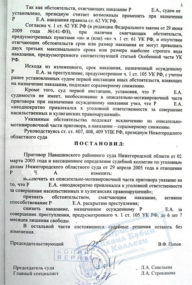 Р. был признан виновным в совершении преступления и осужден по ст. 105 УК РФ к лишению свободы сроком на 9 лет. Осужденный уже отбывал наказание более 6 лет, когда обратился за помощью к нашему адвокату. Адвокат подал в Верховный Суд РФ надзорную жалобу о пересмотре приговора в связи с неучтенными ранее смягчающими обстоятельствами.