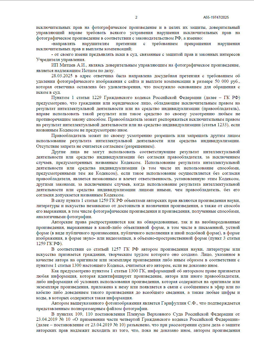 • Техническое подтверждение авторства: суду был представлен полноразмерный файл в формате RAW и скриншоты метаданных, подтверждающие создание фото именно Гарифуллиным в 2017 году.