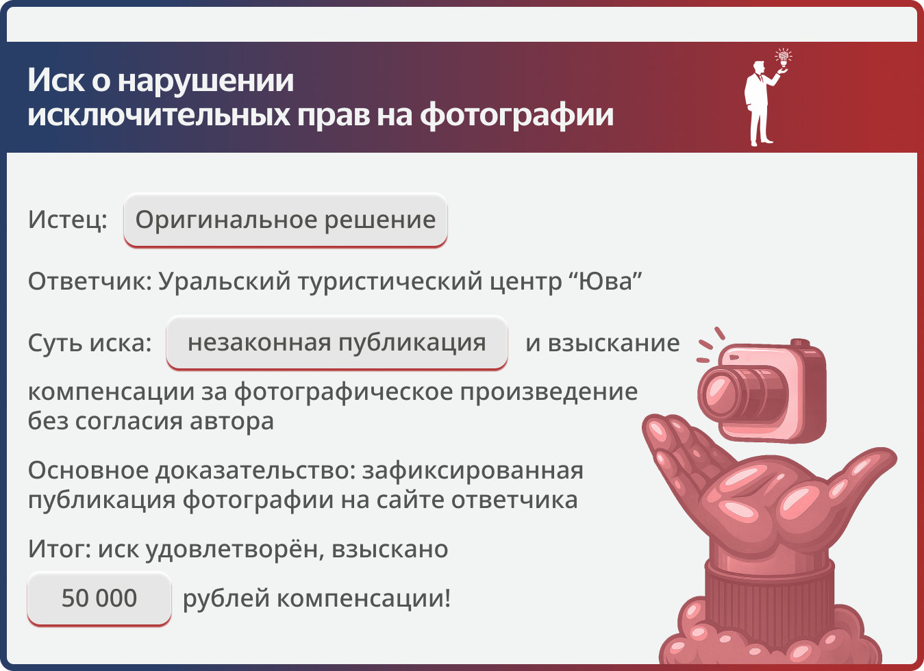 Защитить исключительные права автора на фотографическое произведение, доказать факт и взыскать компенсацию за незаконное использование контента компанией ООО «Уральский туристический центр «Юва».