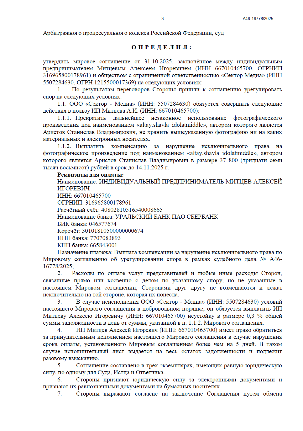 • Запрет на использование: ответчик обязался прекратить использование фото и уничтожить все копии на материальных и электронных носителях.