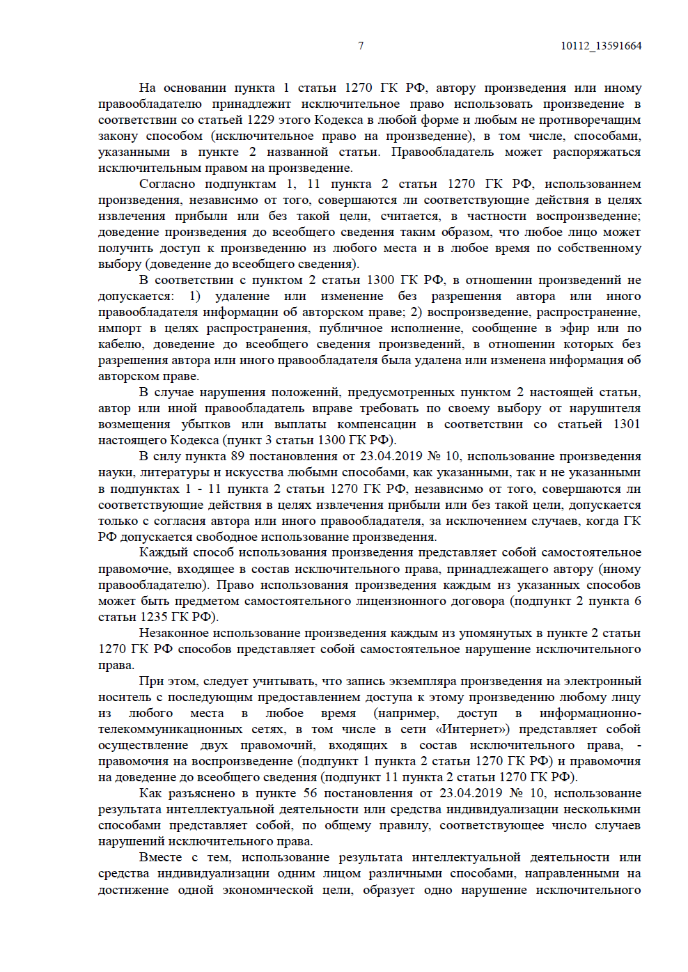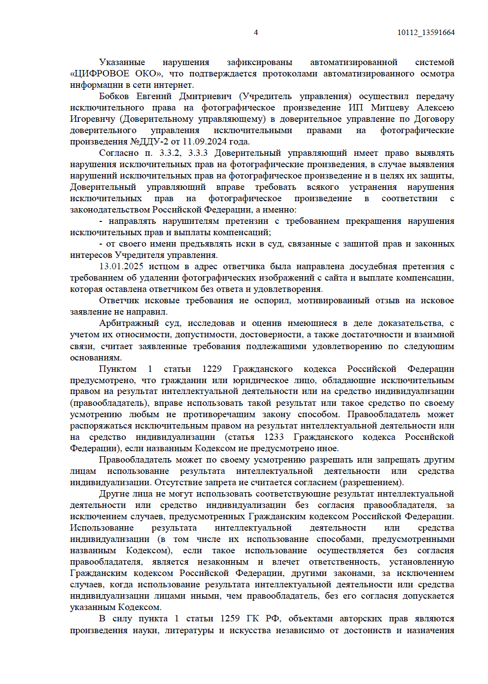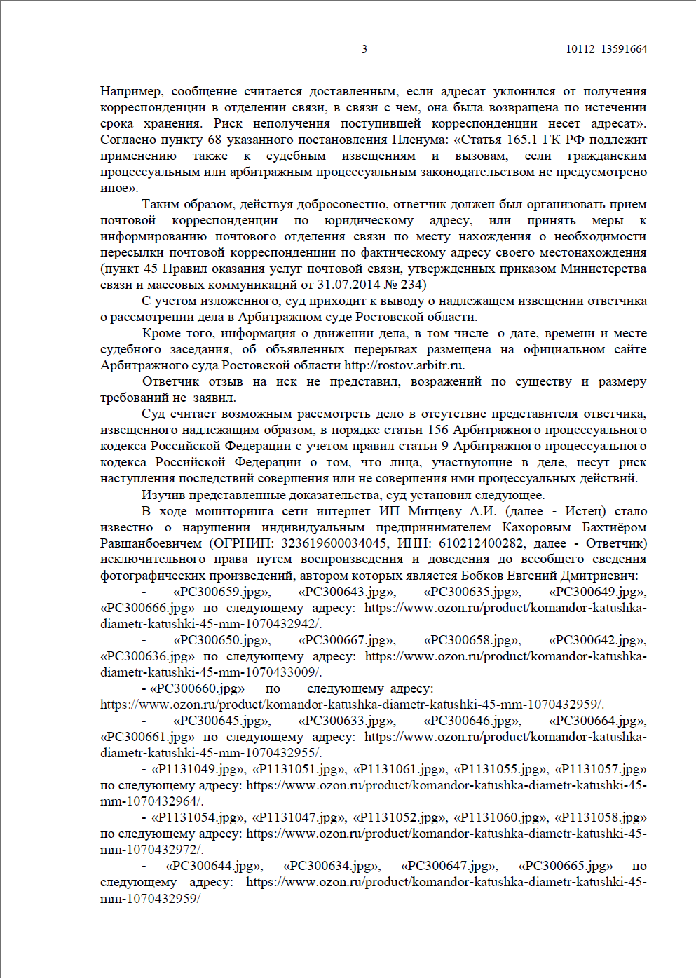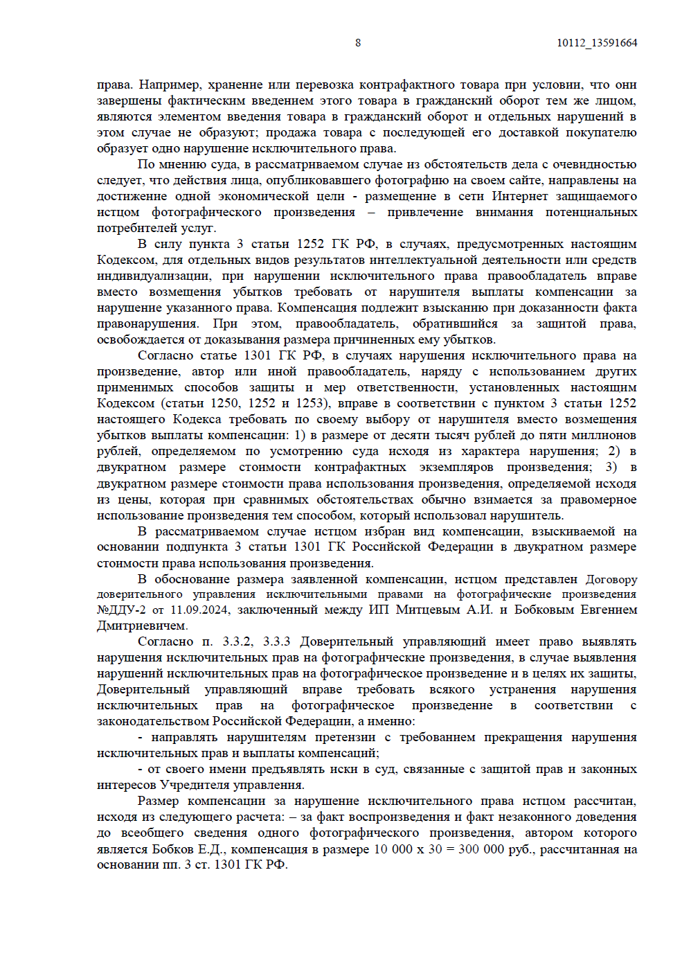 • отсутствие законных оснований. Мы доказали, что Ответчик использовал контент без заключения лицензионного договора. Более того, он не указал имя автора (Бобкова Е.Д.), что исключало возможность применения норм о свободном использовании (ст. 1274 ГК РФ);